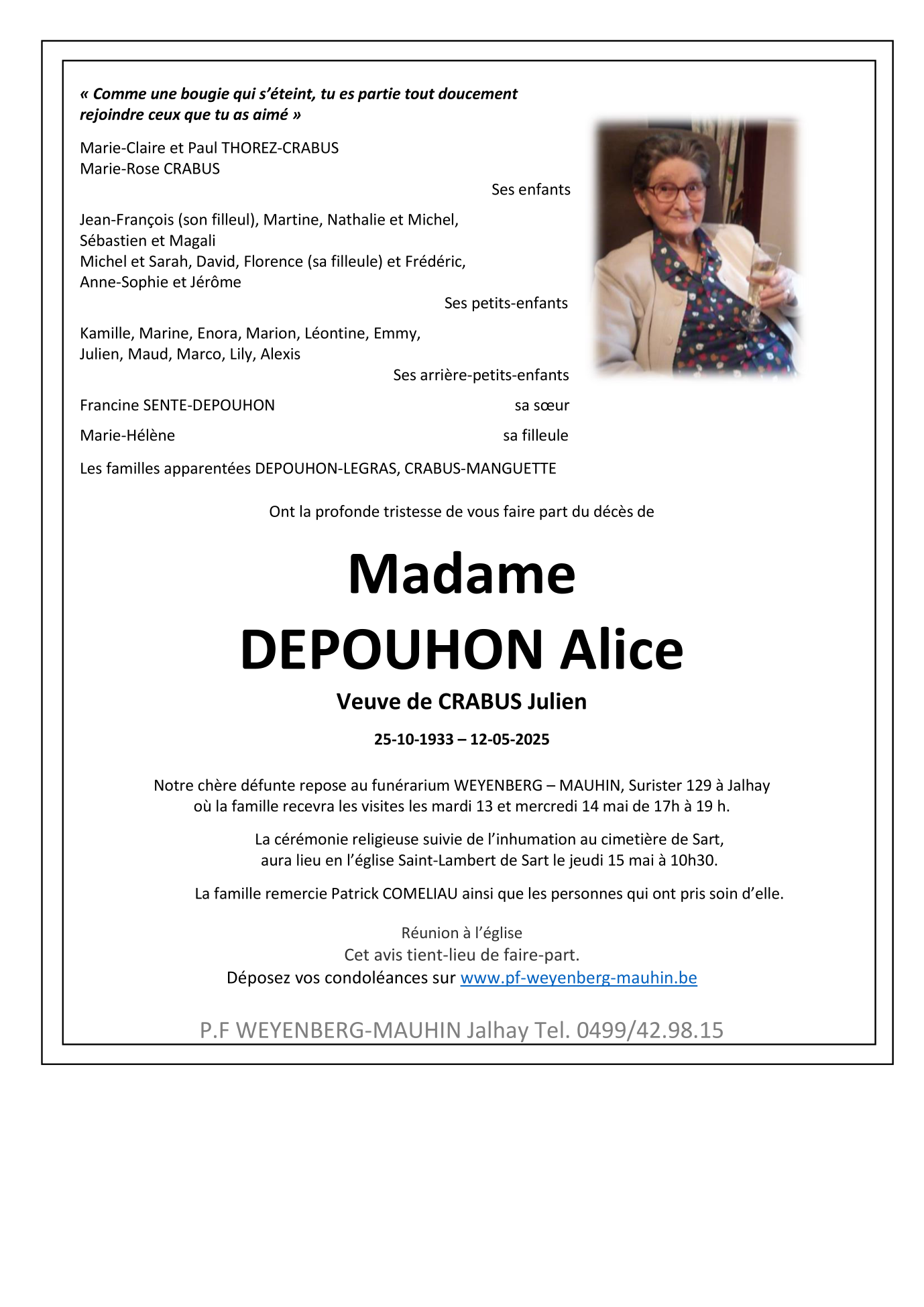 Décédée à Spa (4900) le lundi 12 mai 2025 à l'âge de 91 ans