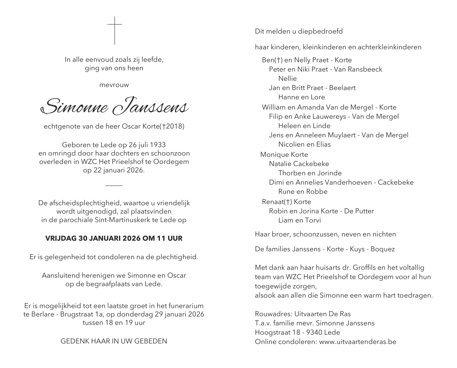 Décédée à Oordegem (9340) le jeudi 22 janvier 2026 à l'âge de 92 ans