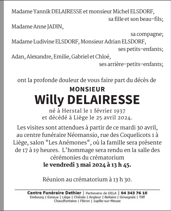 Décédé à Liège (4000) le jeudi 25 avril 2024 à l'âge de 87 ans