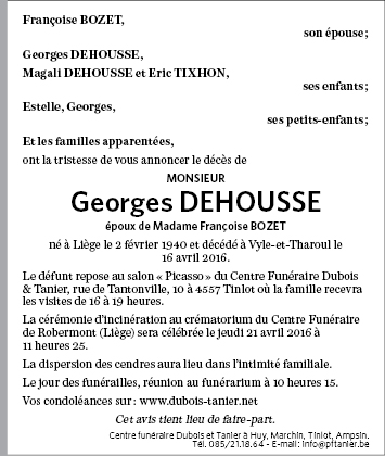 Décédé à Vyle-et-Tharoul (4570) le samedi 16 avril 2016 à l'âge de 76 ans