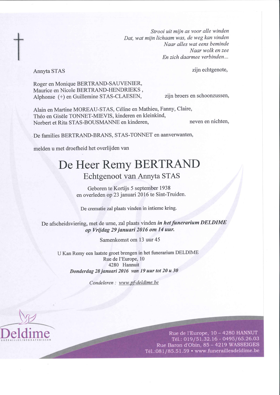 Décédé à Sint-Truiden (3800) le samedi 23 janvier 2016 à l'âge de 77 ans