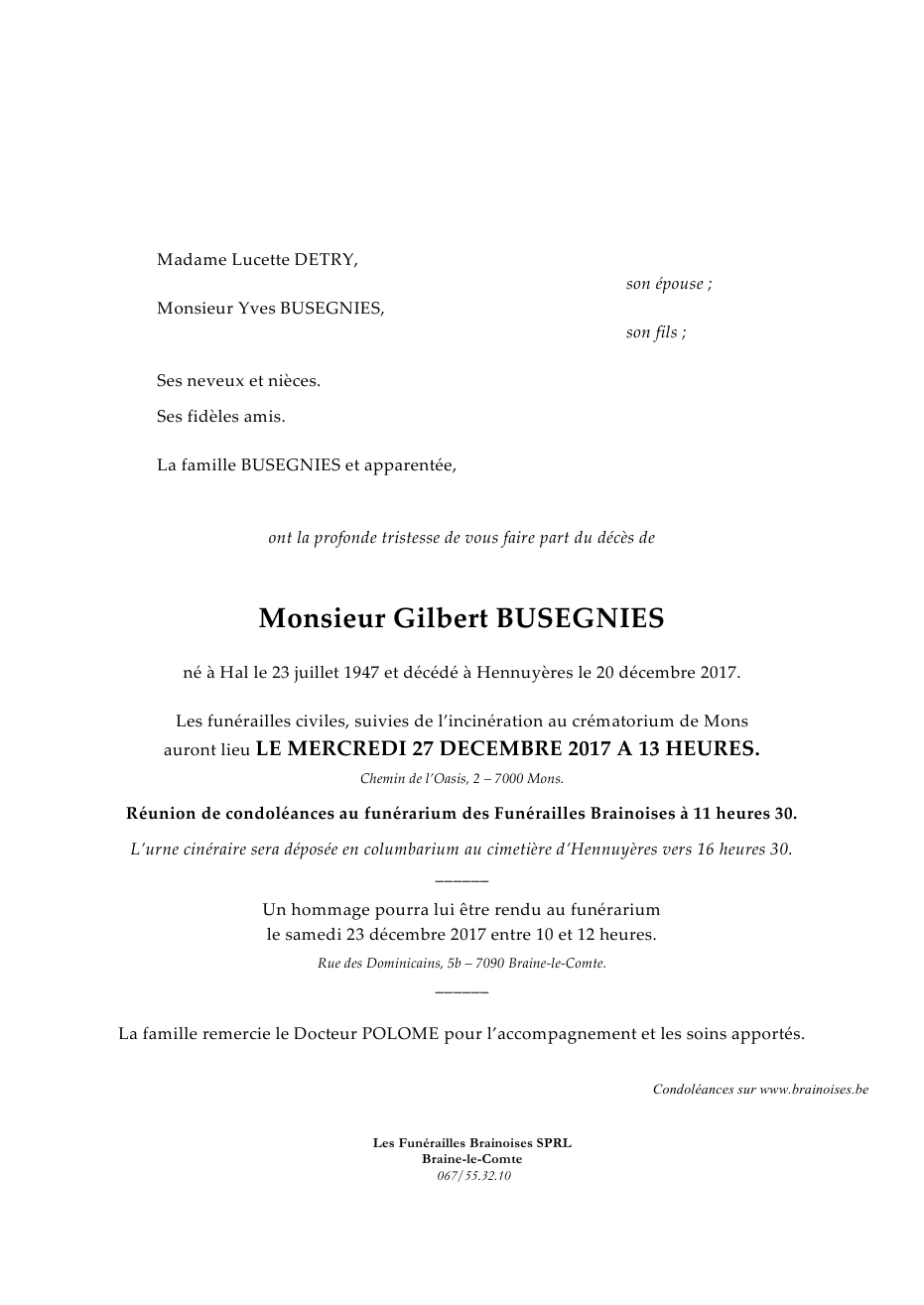 Died in Hennuyères (7090) on 20 December 2017 at the age of 70 years
