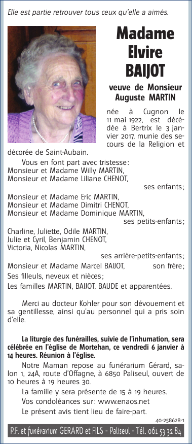 Décédée à Bertrix (6880) le mardi 3 janvier 2017 à l'âge de 94 ans