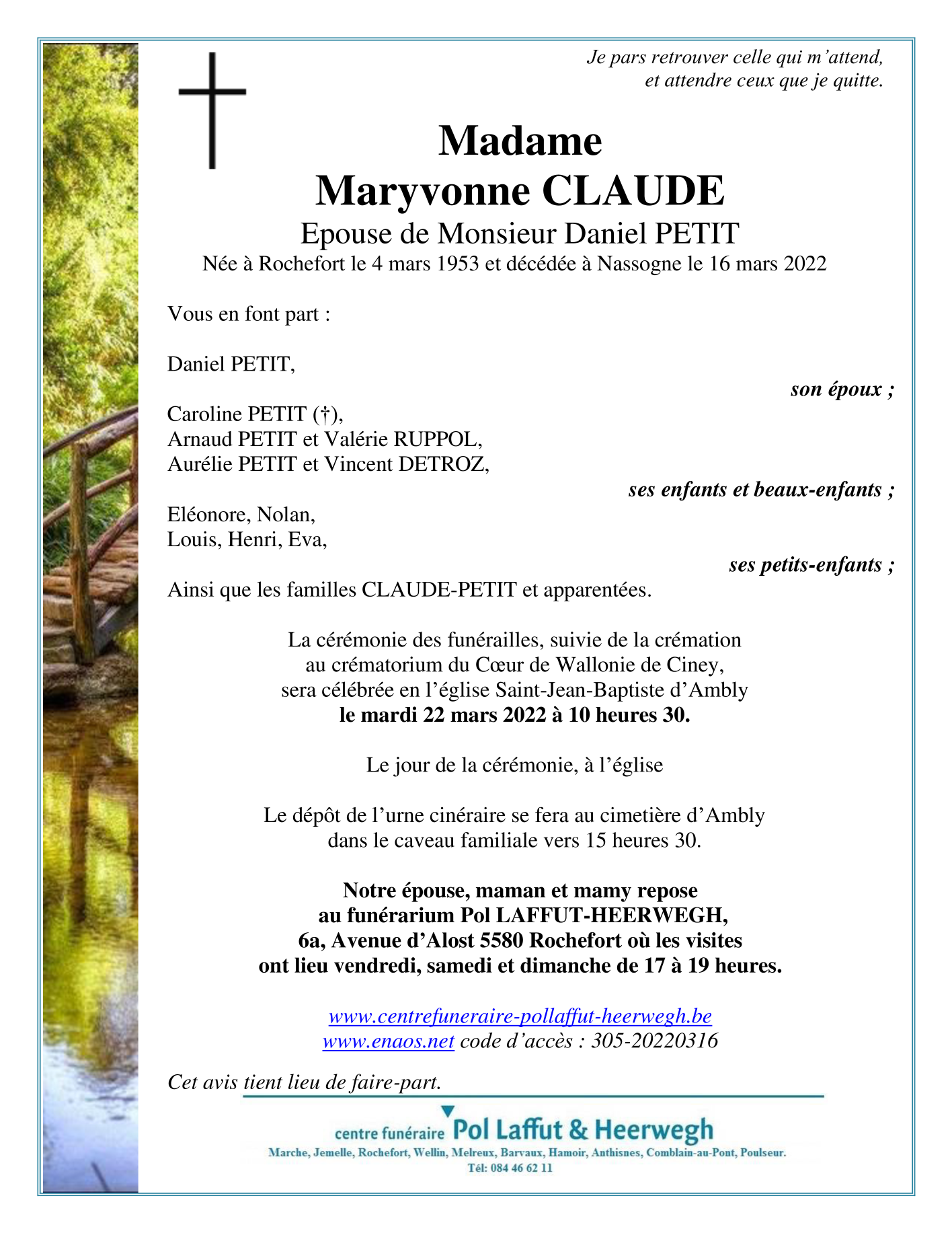 Décédée à Nassogne (6950) le mercredi 16 mars 2022 à l'âge de 69 ans