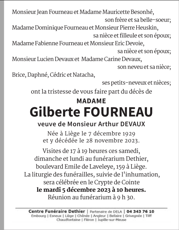 Décédée à Liège (4000) le mardi 28 novembre 2023 à l'âge de 93 ans