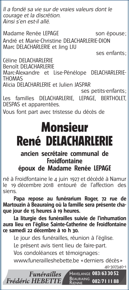 Décédé à Namur (5000) le mercredi 19 décembre 2018 à l'âge de 91 ans