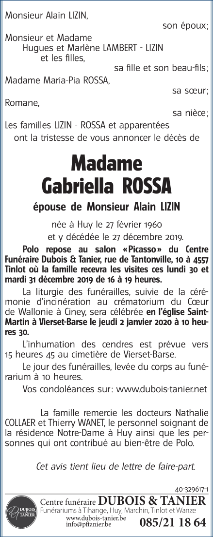 Décédée à Huy (4500) le vendredi 27 décembre 2019 à l'âge de 59 ans