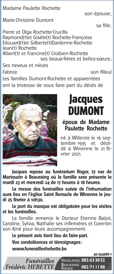 Décédé à Winenne (5570) le dimanche 21 février 2021 à l'âge de 85 ans