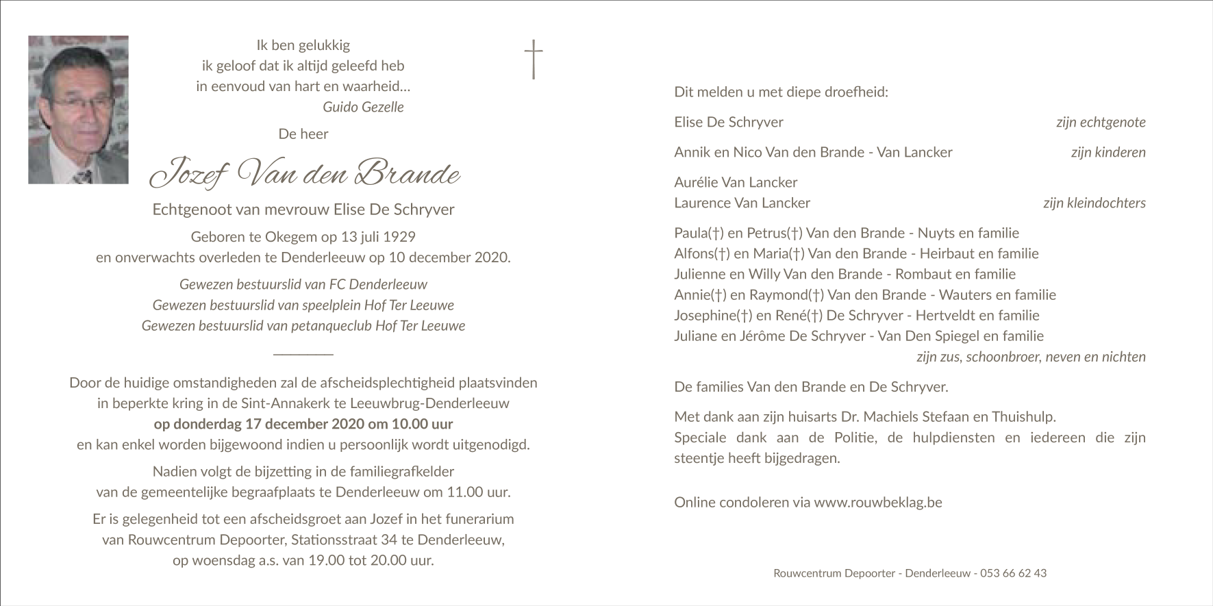 Décédé à Denderleeuw (9470) le jeudi 10 décembre 2020 à l'âge de 91 ans