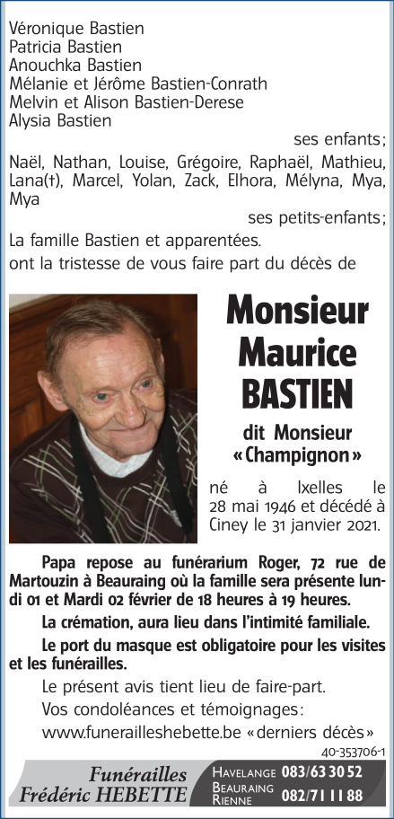 Overleden te Ciney (5590) op zondag 31 januari 2021 op 74-jarige leeftijd