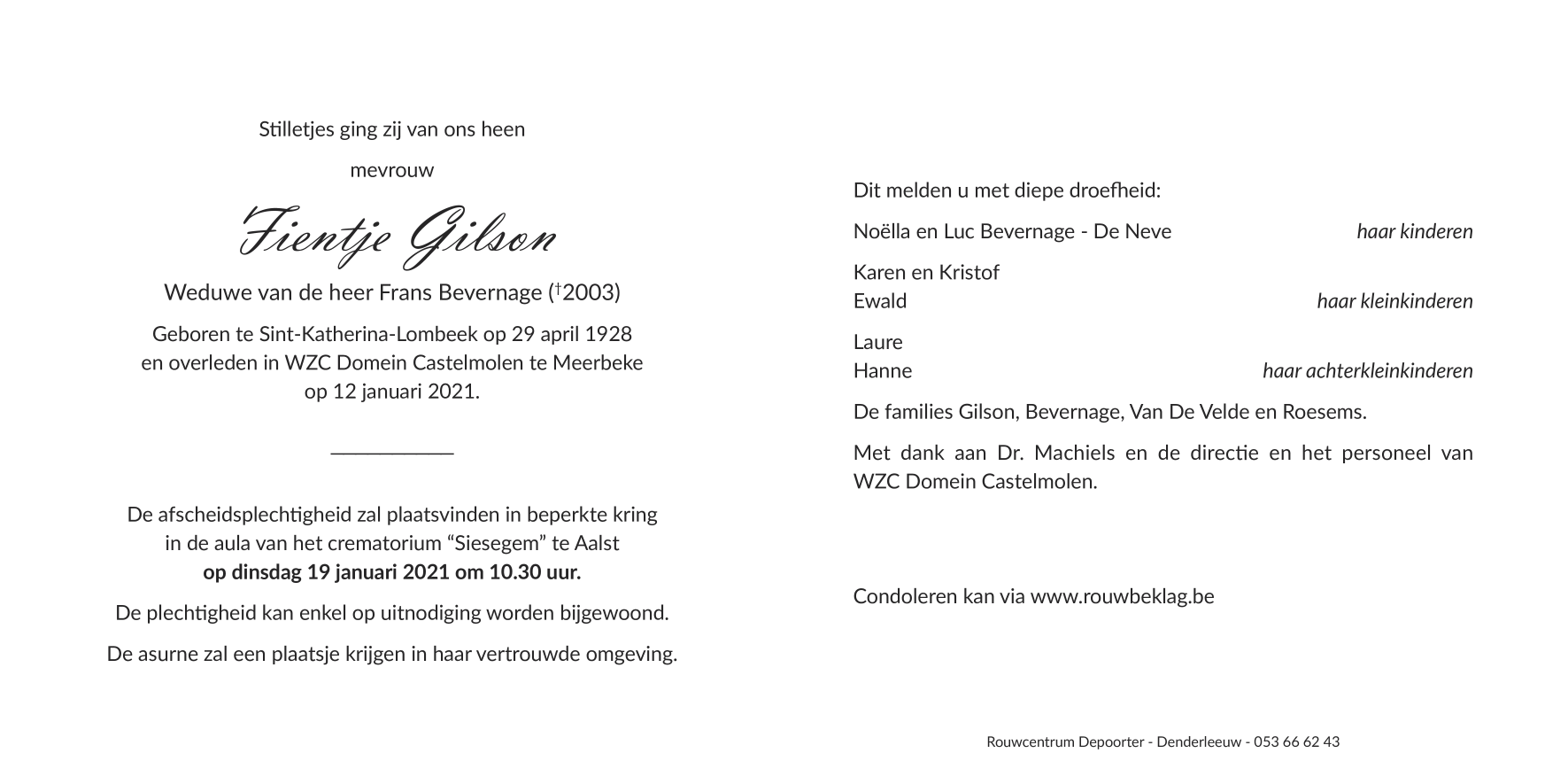 Décédée à Meerbeke (9402) le mardi 12 janvier 2021 à l'âge de 92 ans