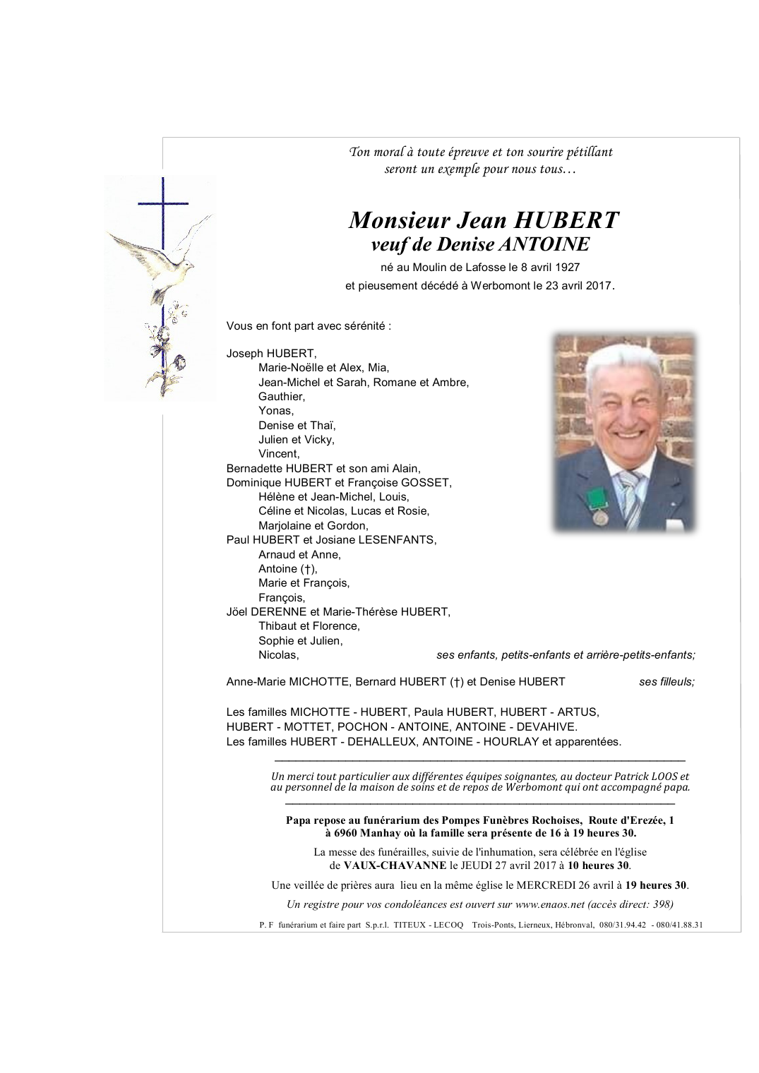 Décédé à Werbomont (4190) le dimanche 23 avril 2017 à l'âge de 90 ans