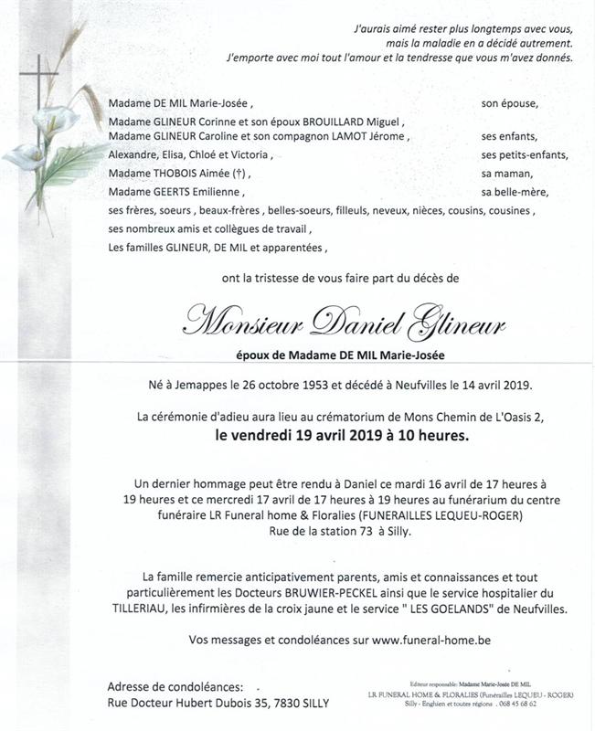 Décédé à Neufvilles (7063) le dimanche 14 avril 2019 à l'âge de 65 ans