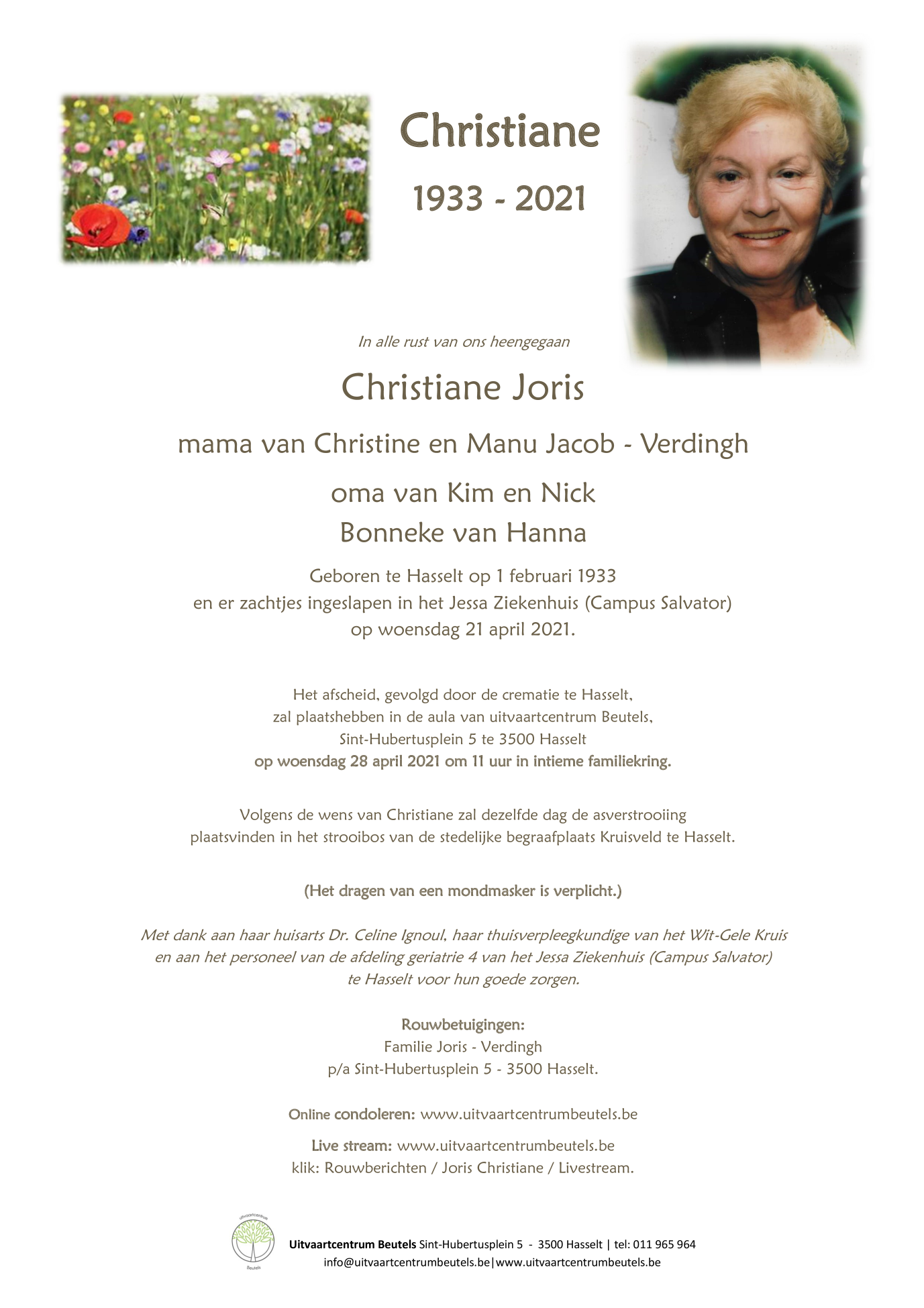 Fallecida en Hasselt (3500) el miércoles, 21 de abril de 2021 a la edad de 88 años