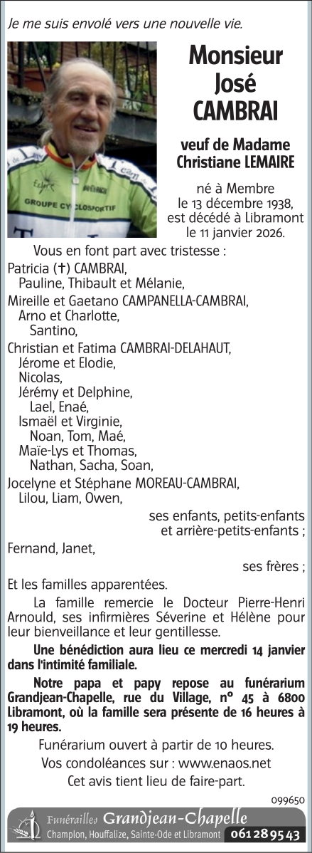 Décédé à Libramont (6800) le dimanche 11 janvier 2026 à l'âge de 87 ans
