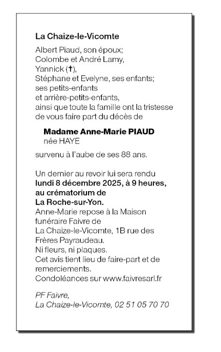 Overleden te La Chaize-le-Vicomte (85310, Frankrijk) op donderdag 4 december 2025 op 87-jarige leeftijd