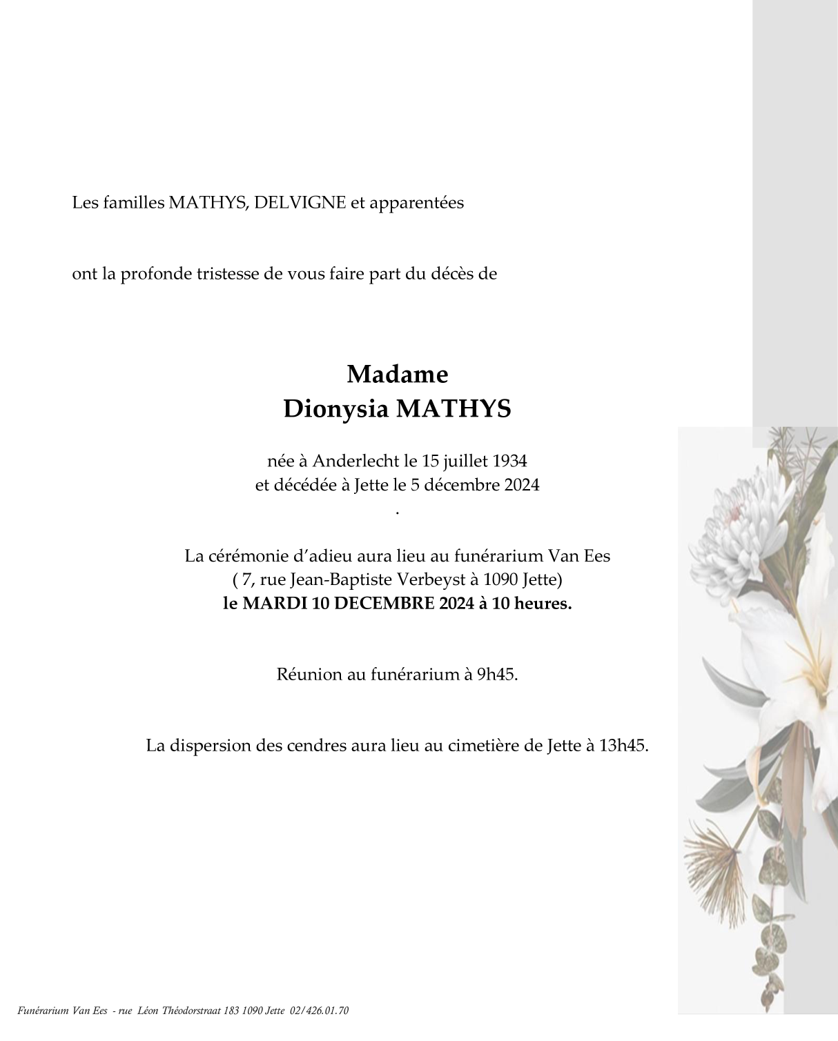 Décédée à Bruxelles (Jette) (1090) le jeudi 5 décembre 2024 à l'âge de 90 ans