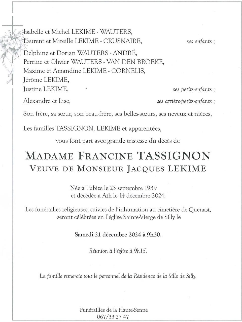 Overleden te Ath (7800) op zaterdag 14 december 2024 op 85-jarige leeftijd