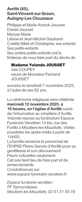 Décédée à Avrillé (85440, France) le vendredi 7 novembre 2025 à l'âge de 91 ans