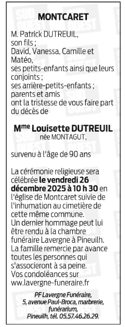 Décédée à Sainte-Foy-la-Grande (33220, France) le vendredi 19 décembre 2025 à l'âge de 90 ans