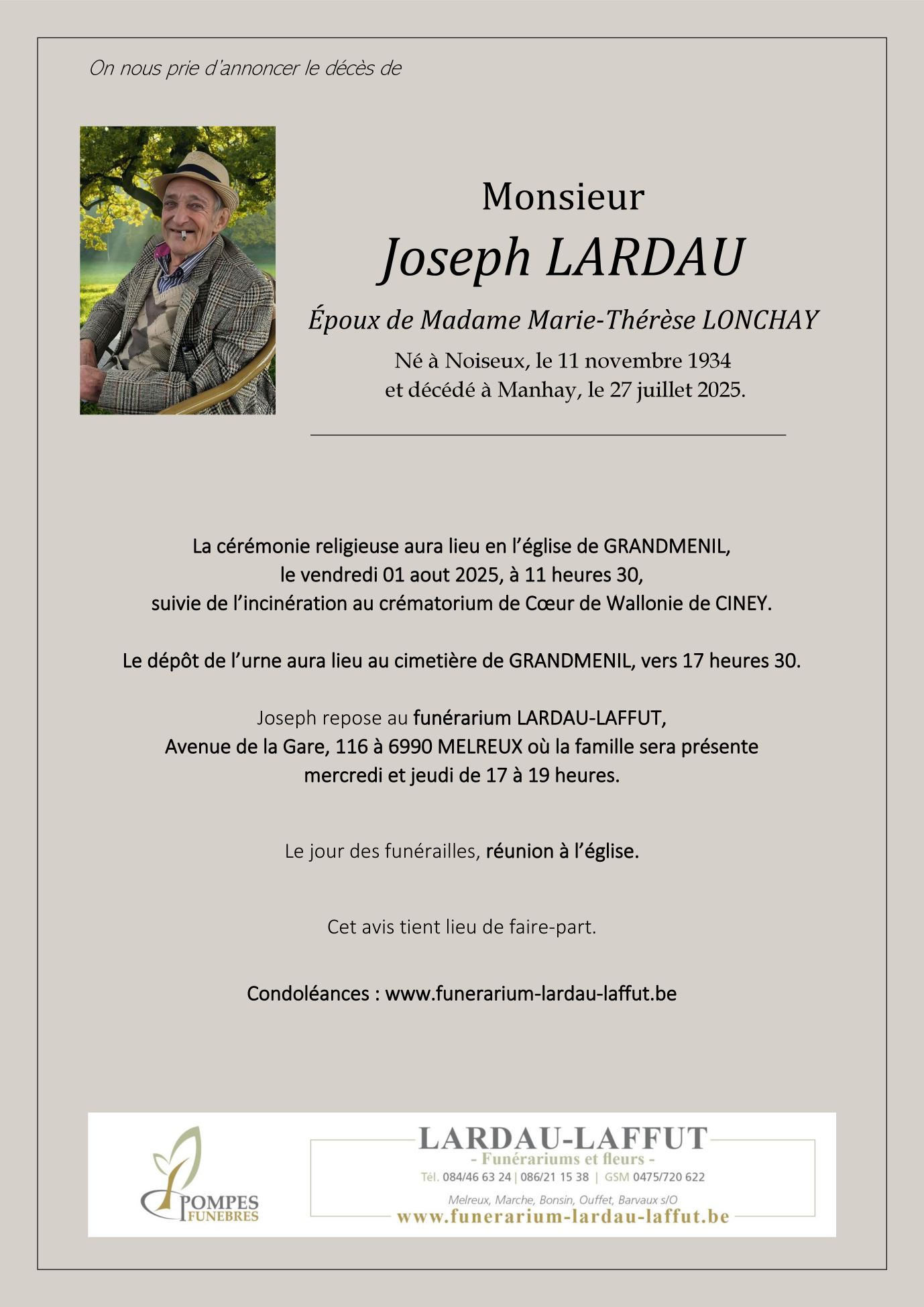 Décédé à Manhay (6960) le dimanche 27 juillet 2025 à l'âge de 90 ans