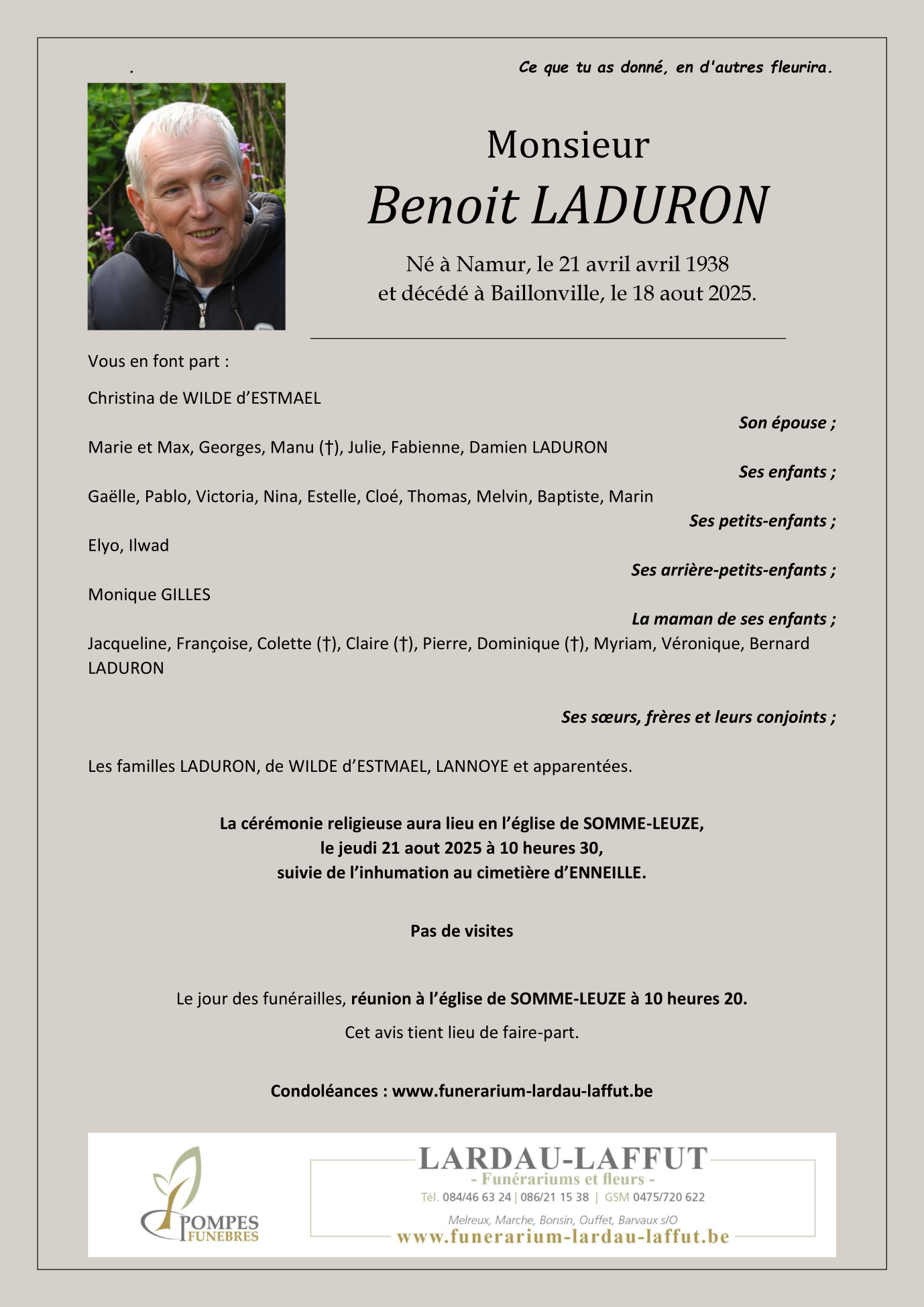 Décédé à Baillonville (5377) le lundi 18 août 2025 à l'âge de 87 ans