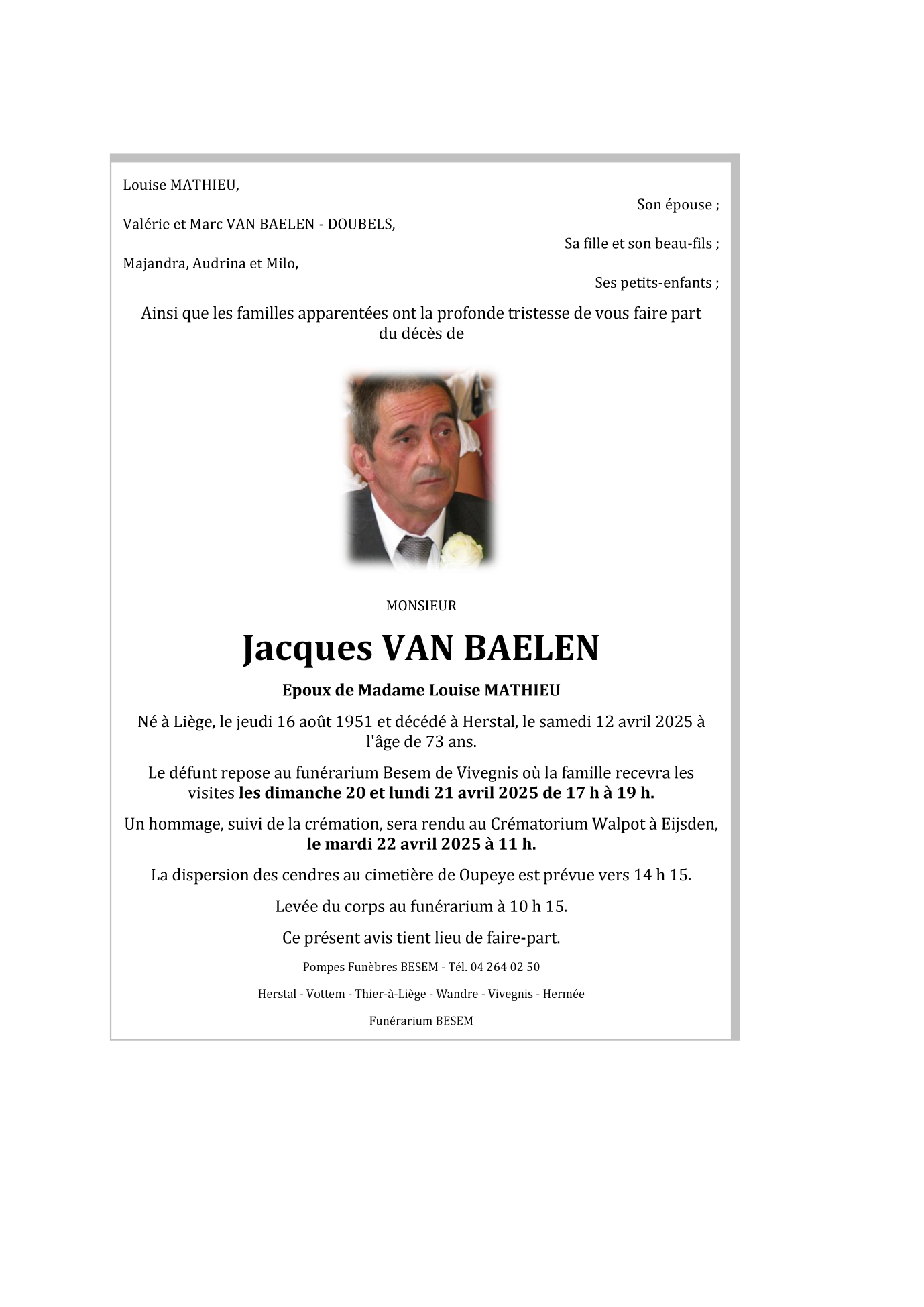Fallecido en Herstal (4040) el sábado, 12 de abril de 2025 a la edad de 73 años