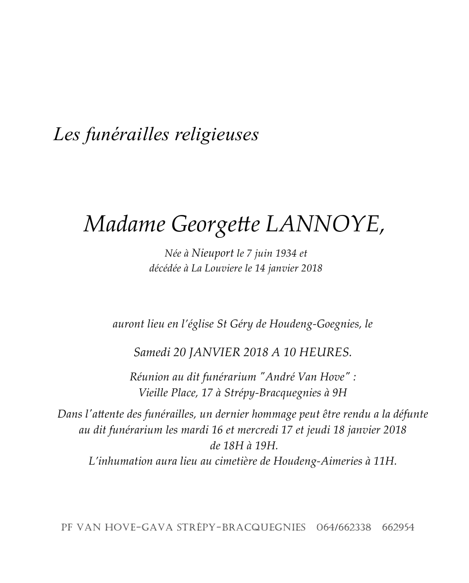 Overleden te La Louvière (7100) op zondag 14 januari 2018 op 83-jarige leeftijd