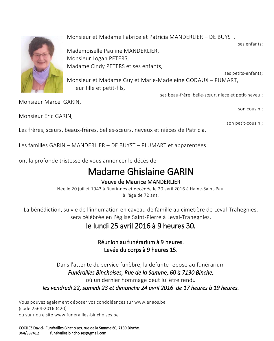 Décédée à Haine-Saint-Paul (7100) le mercredi 20 avril 2016 à l'âge de 72 ans
