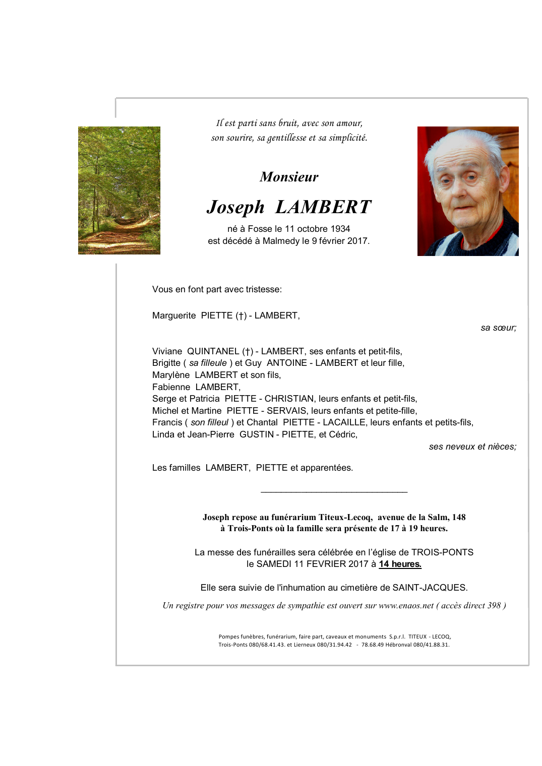Né à Fosse sur Salm (4980) le jeudi 11 octobre 1934