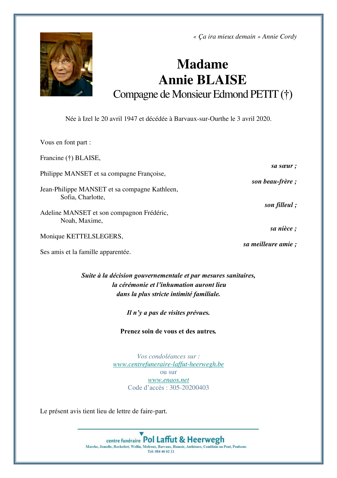 Overleden te Barvaux-sur-Ourthe (6940) op vrijdag 3 april 2020 op 72-jarige leeftijd