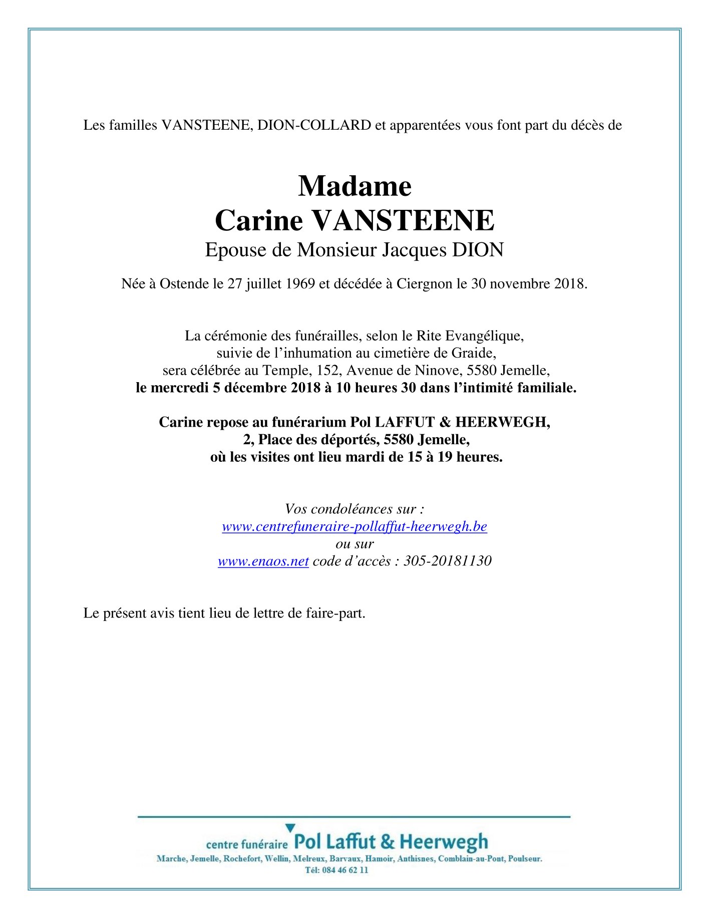 Fallecida en Ciergnon (5560) el viernes, 30 de noviembre de 2018 a la edad de 49 años