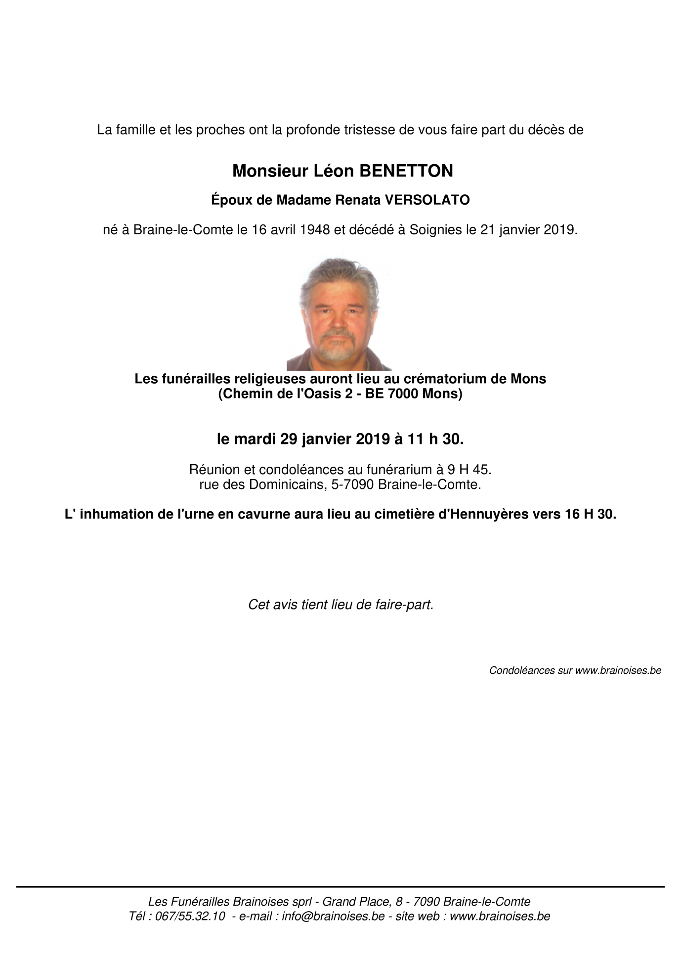 Overleden te Soignies (7060) op maandag 21 januari 2019 op 70-jarige leeftijd