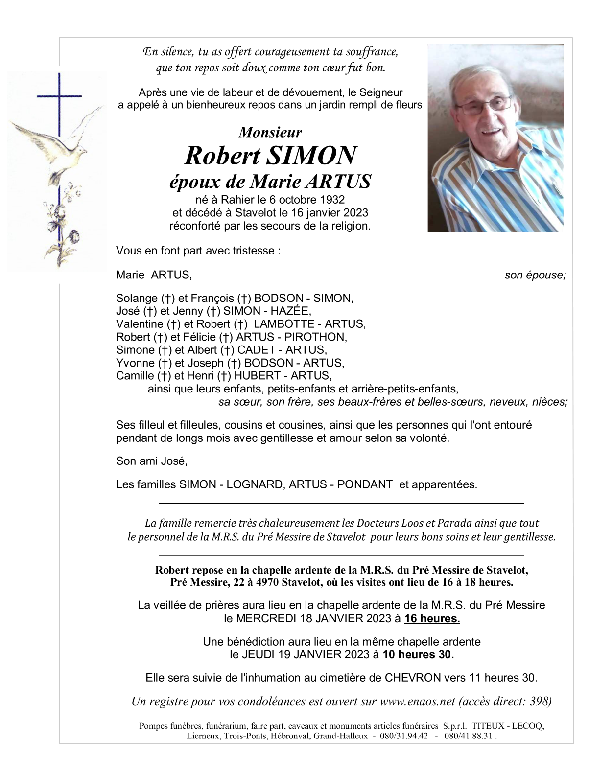 Décédé à Stavelot (4970) le lundi 16 janvier 2023 à l'âge de 90 ans