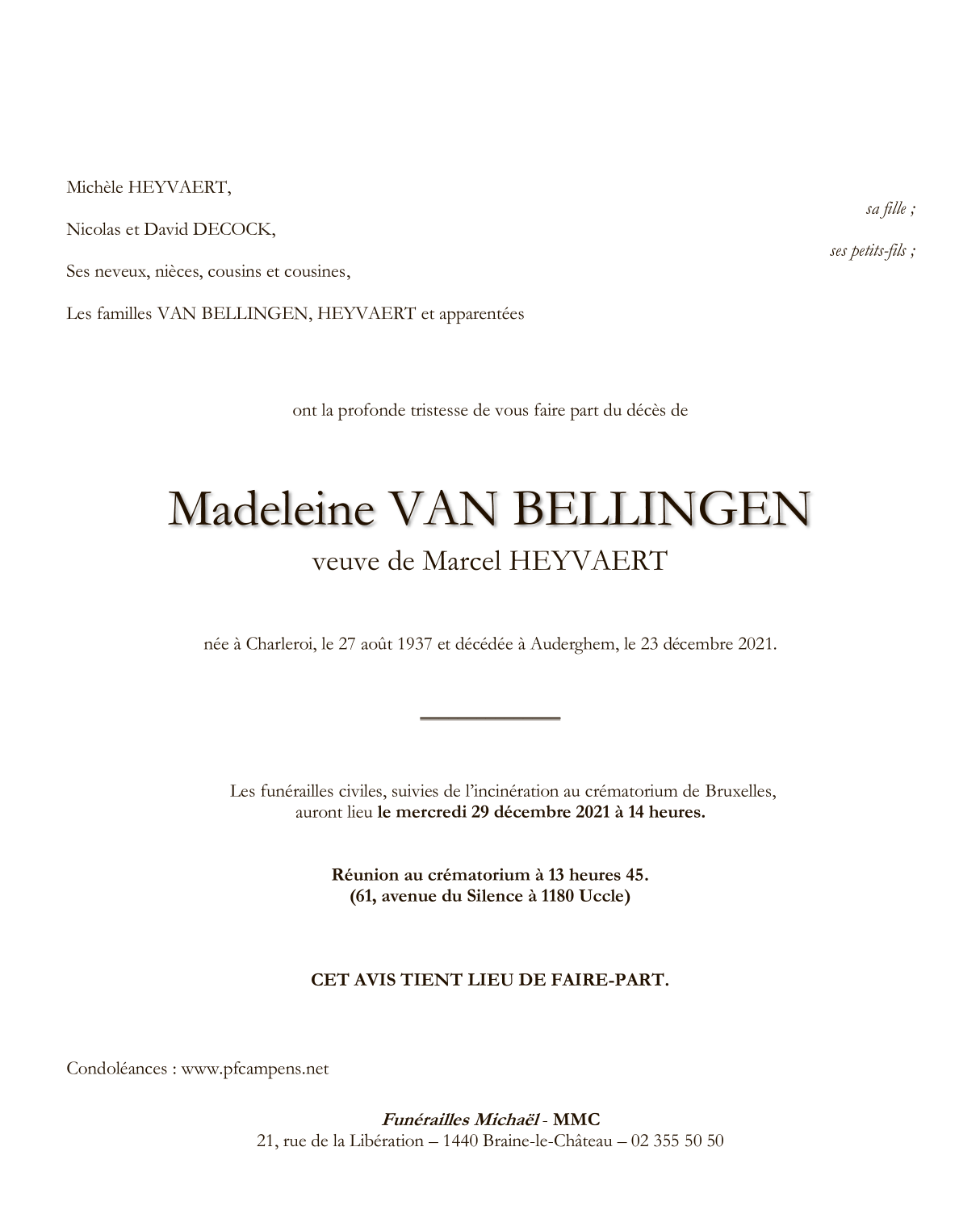 Décédée à Auderghem (1160) le jeudi 23 décembre 2021 à l'âge de 84 ans