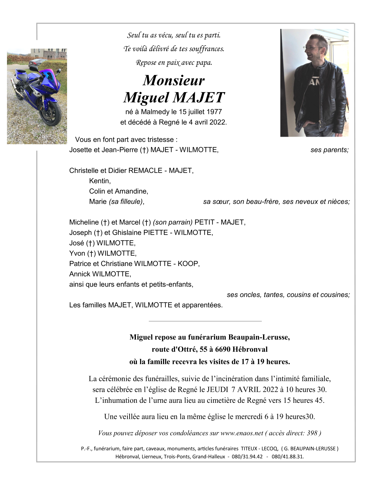 Died in Regné (6690) on 04 April 2022 at the age of 44 years