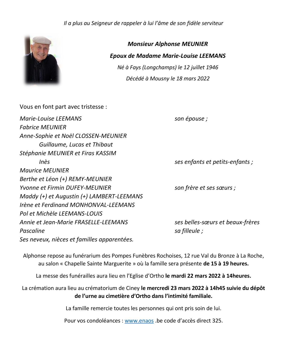 Décédé à Mousny (6983) le vendredi 18 mars 2022 à l'âge de 75 ans