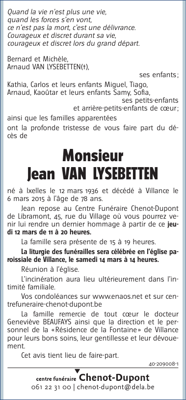 Décédé à Villance (6890) le vendredi 6 mars 2015 à l'âge de 78 ans