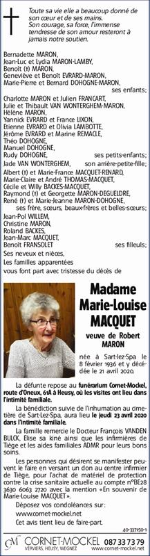 Fallecida en Jalhay (4845) el martes, 21 de abril de 2020 a la edad de 84 años
