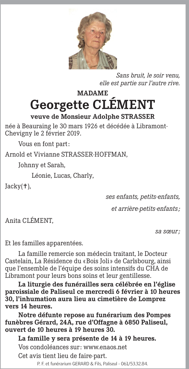 Overleden te Libramont (6800) op zaterdag 2 februari 2019 op 92-jarige leeftijd