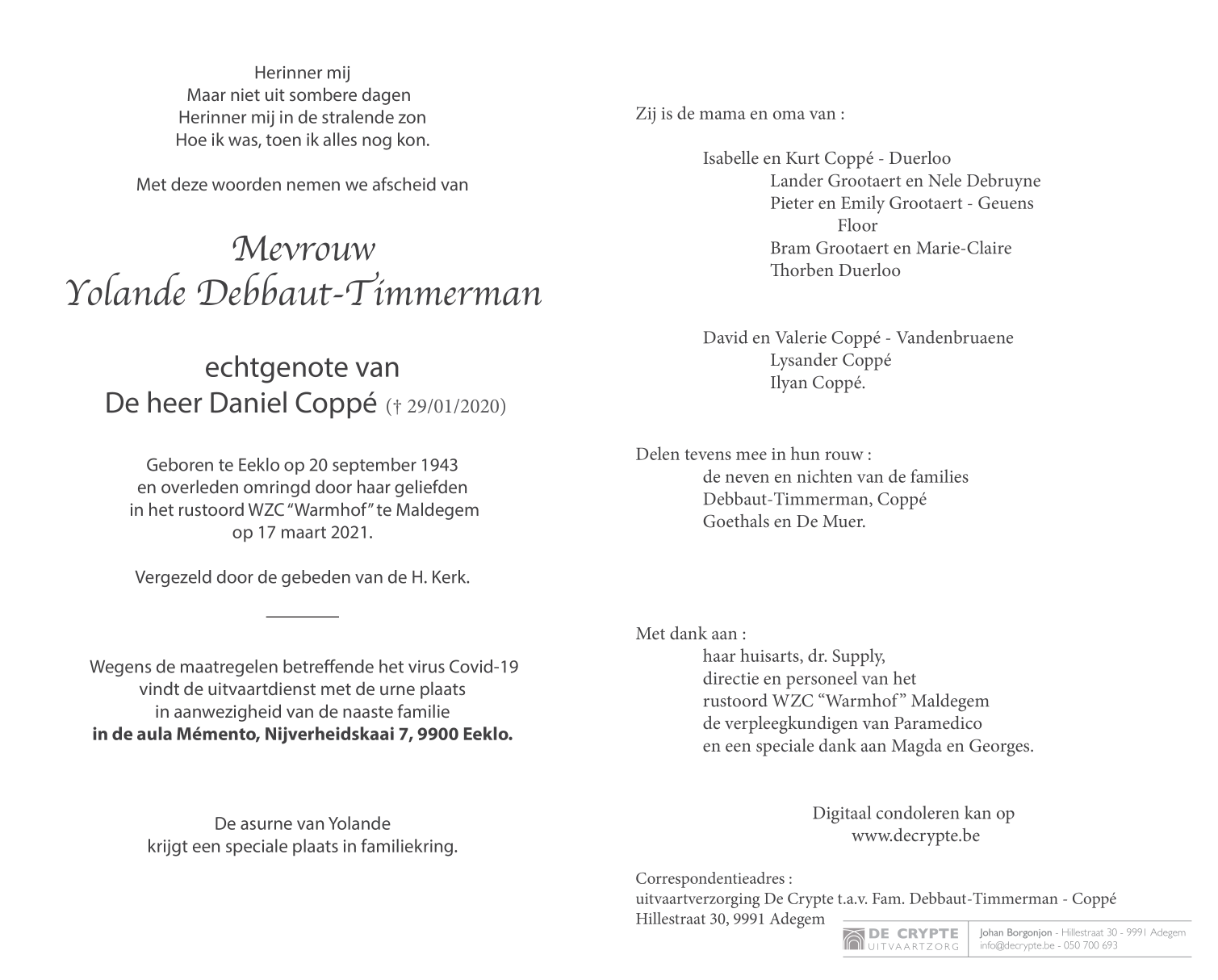 Décédée à Maldegem (9990) le mercredi 17 mars 2021 à l'âge de 77 ans