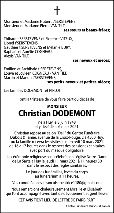 Décédé à Huy (4500) le samedi 6 mars 2021 à l'âge de 72 ans