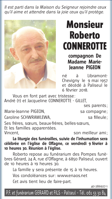 Overleden te Paliseul (6850) op dinsdag 6 februari 2018 op 60-jarige leeftijd