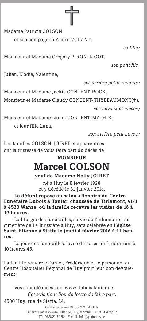 Fallecido en Huy (4500) el domingo, 31 de enero de 2016 a la edad de 87 años
