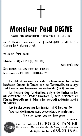 Overleden te Clavier (4560) op zaterdag 6 februari 2016 op 87-jarige leeftijd