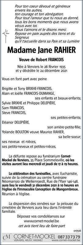 Décédée à Verviers (4800) le vendredi 24 décembre 2021 à l'âge de 86 ans