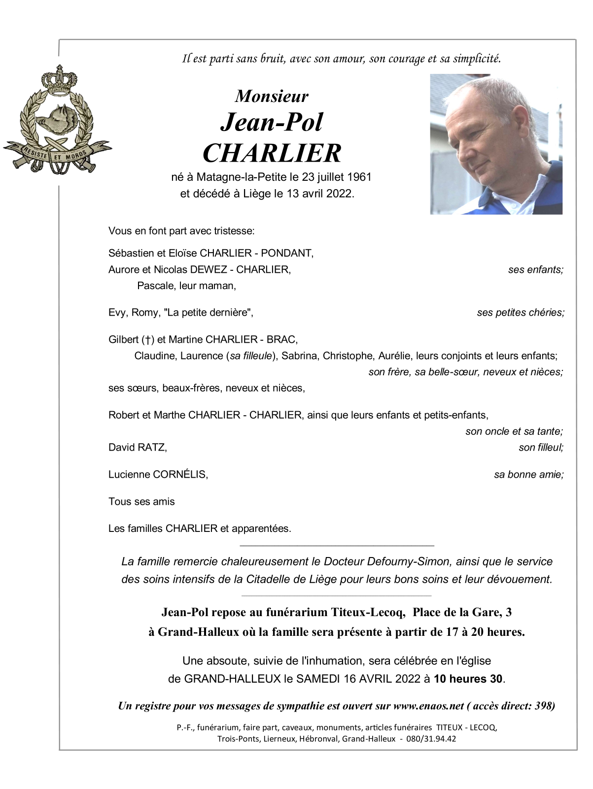 Décédé à Liège (4000) le mercredi 13 avril 2022 à l'âge de 60 ans