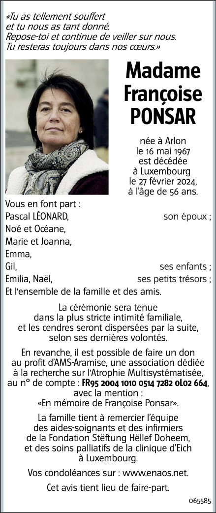 Décédée à Luxembourg/Eich  (1450, Luxembourg) le mardi 27 février 2024 à l'âge de 56 ans