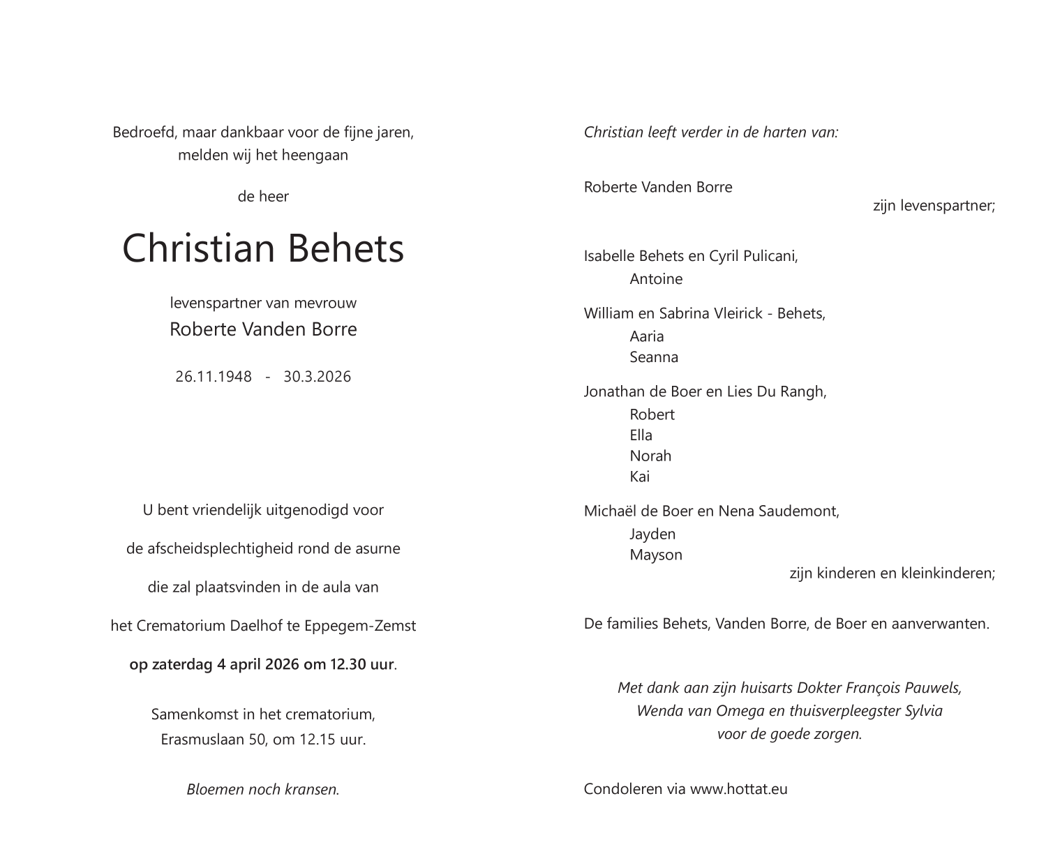 Décédé à Meise (1860) le lundi 30 mars 2026 à l'âge de 77 ans