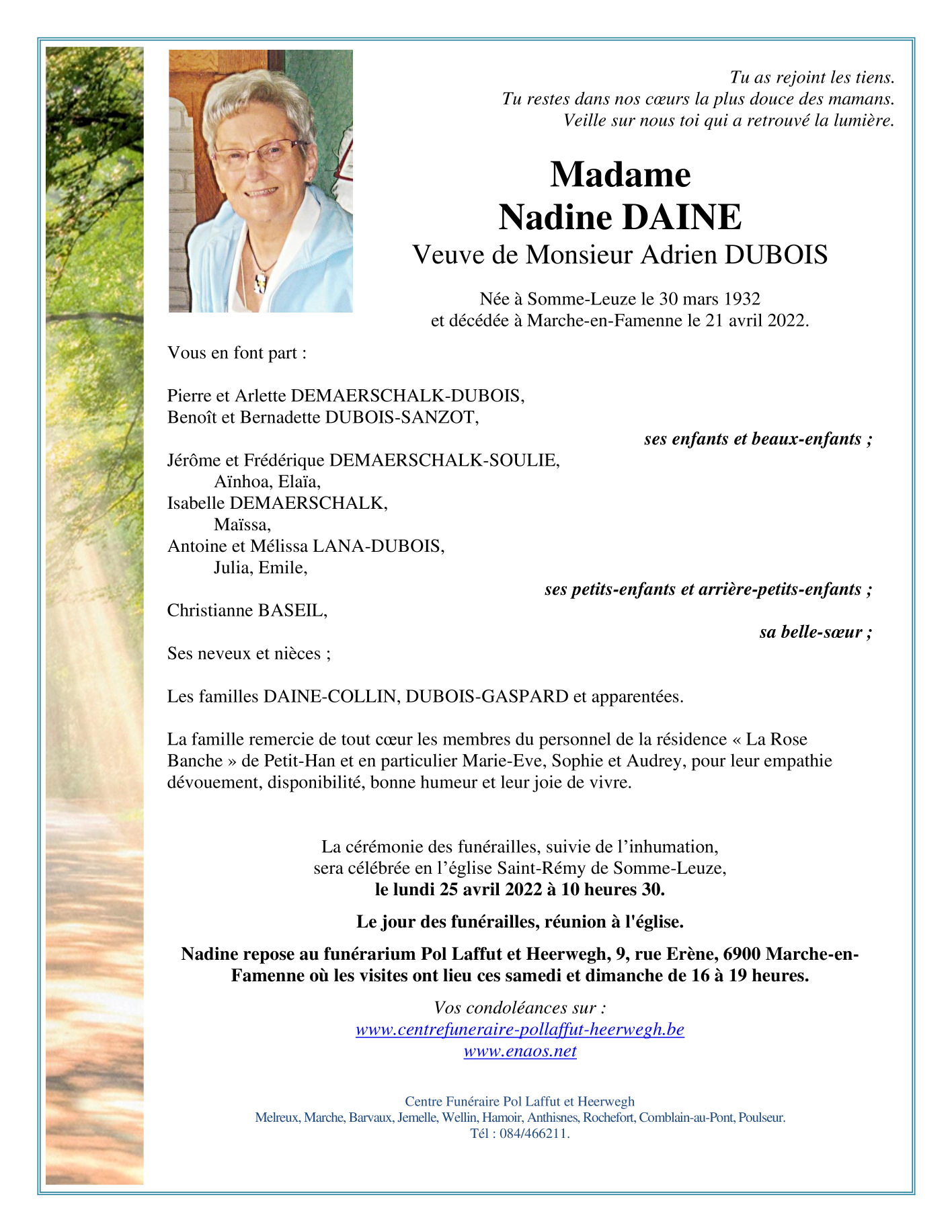 Décédée à Marche-en-Famenne (6900) le jeudi 21 avril 2022 à l'âge de 90 ans